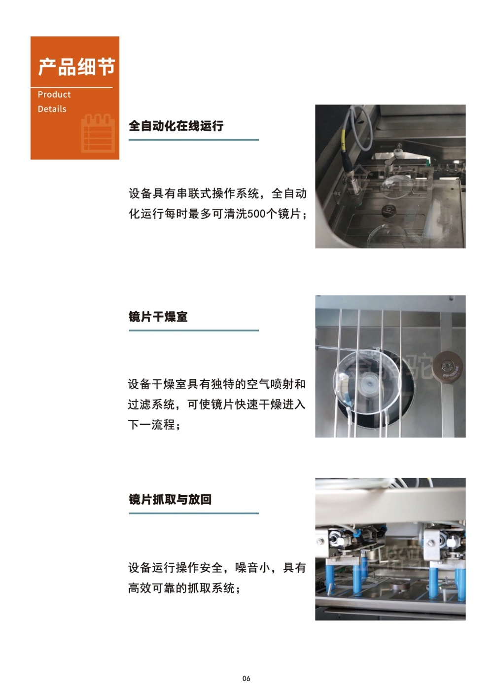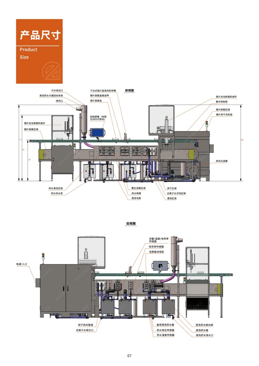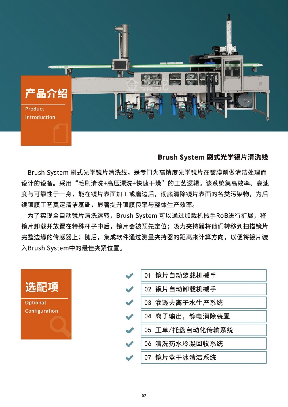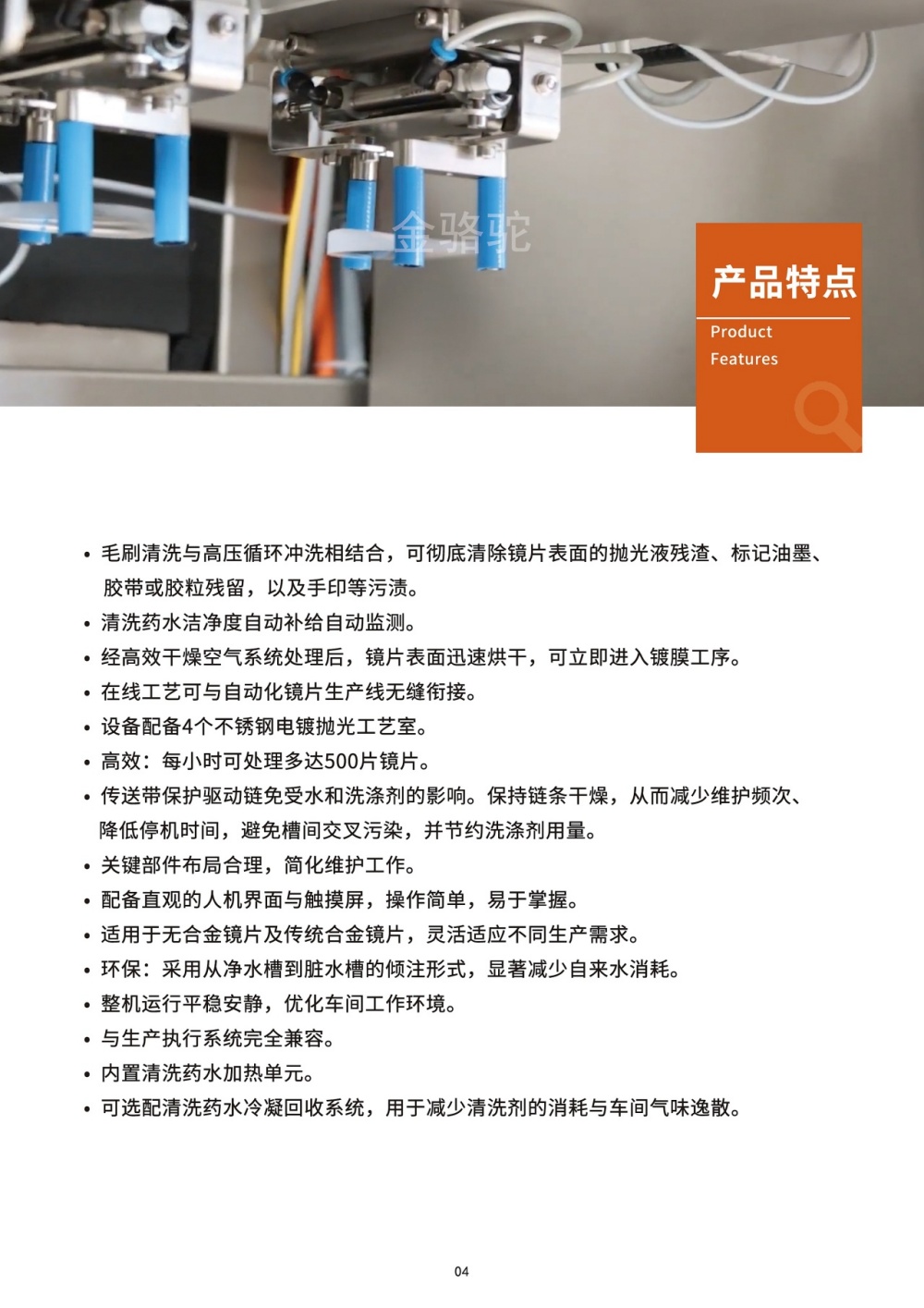 该设备是一个全自动化刷式光学镜片清洗系统,具备强大且高效的串联式系统,可以清除化学品残留、指纹等污染物,为后续涂层工艺准备好各种不同型号的镜片。